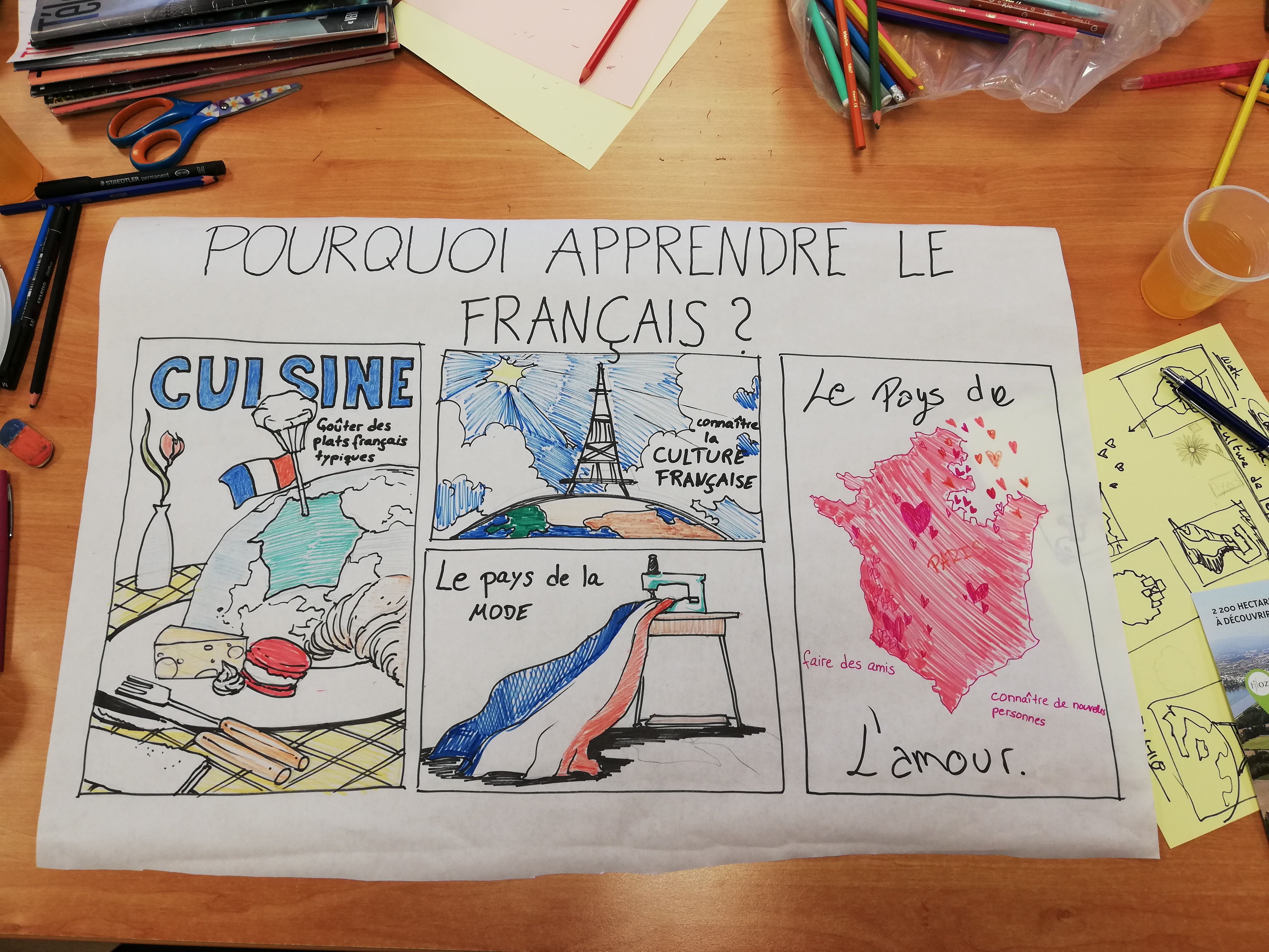 In our school, we’re learning French while having fun after classes, with the many cultural activities organized in our foyer that everyone can join! We share good conversation while playing board games, drawing, or making posters during one of our creative workshops, or making our own ice cream (which by the way was really good!). We also watch French movies and explain the university system every month.