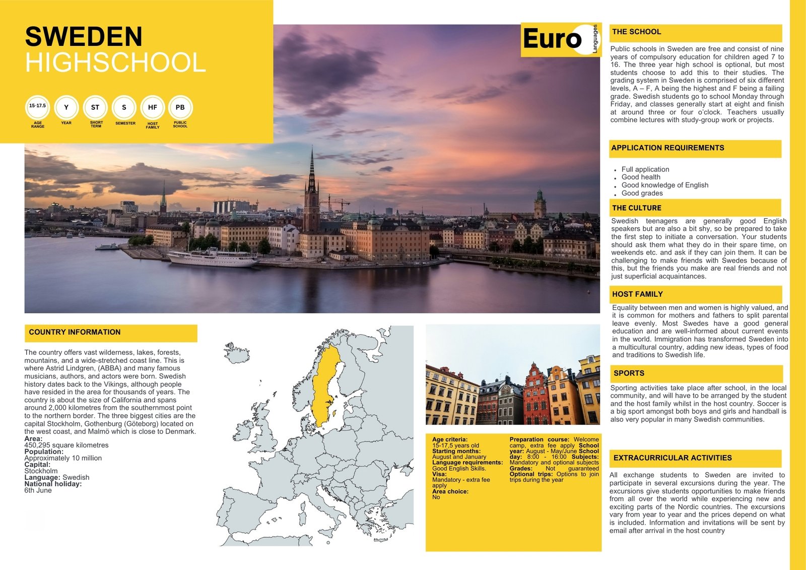 School in Sweden is compulsory for all children between 7 and 16 years of age. You attend high school, called gymnasium, between the age of 16 to 19. This is voluntary but almost all Swedish young people choose to attend. Swedish students can choose from a variety of high school programmes, such as economics, social sciences, natural sciences and aesthetics. Exchange students are usually placed in the first or second grade in high school.